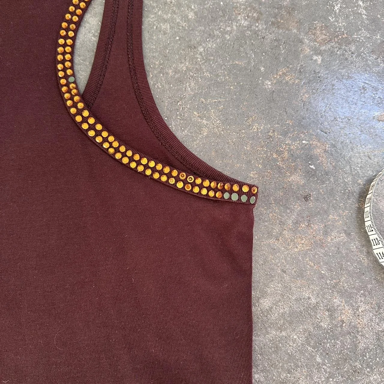 This absolutely iconic and RARE D&G tank was made in Italy in the early-2000s. Cut from a rich brown ribbed cotton, this piece features a bold “TAKE CARE OF SECONDS” graphic fully done in gold + crystal rhinestones and matching studded trim along the neckline and armholes. **There are a couple rhinestones missing on the shoulders as shown