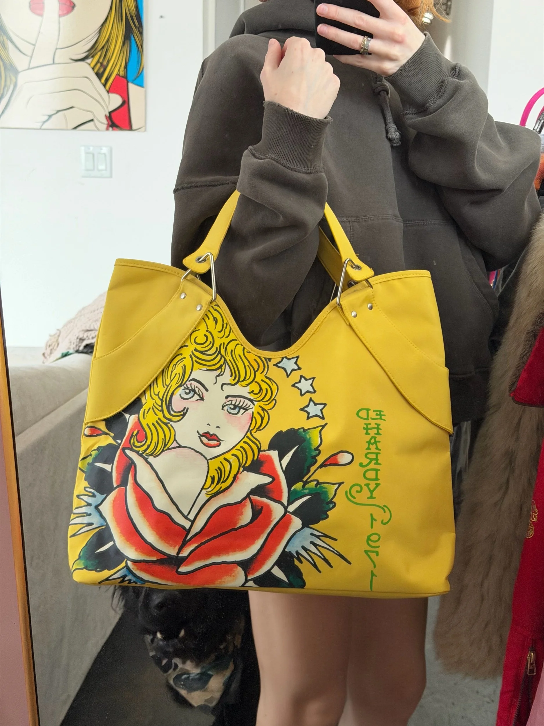 Bright yellow Ed Hardy tote featuring iconic tattoo-style pin-up + rose graphic. Oversized, lightweight, and perfect for everyday use. A rare early 2000s statement piece. In excellent condition
